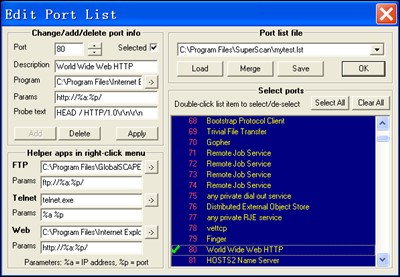 修改select ports如图所示,去掉所有其他端口前的绿钩,(单击该端口即可)最终只保留80端口,然后单击save,把端口配置表保存到硬盘上,以后每次使用superscan的时候就不再需要从新配置,只需要load即可。