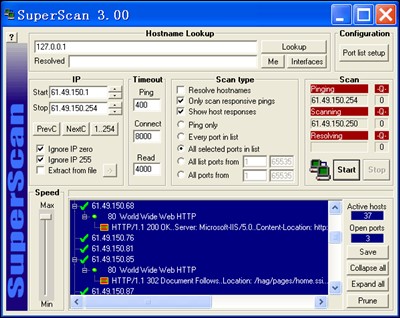 一般我们在开始地址处输入自己的IP段首地址,即61.49.*.1,结束IP地址会自动显示出61.49.*.254,这里需要说明的是,旁边那个ping,以及connect数据需要根据自己的情况输入,对于本网段的IP,即IP地址前3部分与自己的IP地址相同的IP,在扫描的时候可以把这些数据设置的短小一些,而对于其他网段的地址,一般需要设置的大一点。具体情况根据扫描结果而定,如果输入的数据太小,扫描之后会找不到计算机。