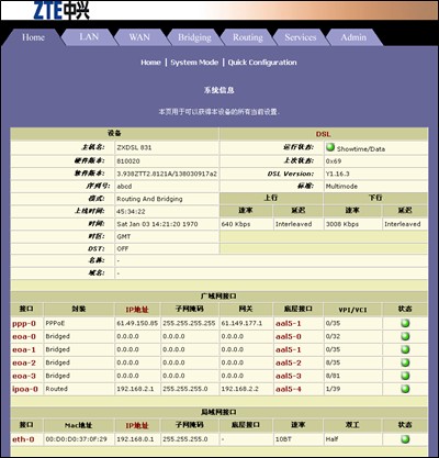 通过刚才连接页上的标志,我们可以肯定这是一台中兴831路由器,输入出厂默认的用户名、密码:ZXDSL、ZXDSL,就进入了配置界面: