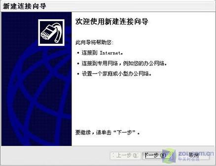 (1)打开“控制面板”,双击“网络连接”图标,在随后弹出的“网络连接”窗口中,单击左侧的“创建一个新的连接”(如图4),然后进入“新建连接向导”窗口,单击“下一步”按钮(如图5)。