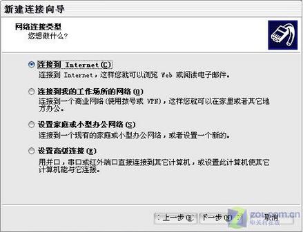 (2)在“网络连接类型”中勾选第一项“连接到Internet”,单击“下一步”按钮(如图6)。