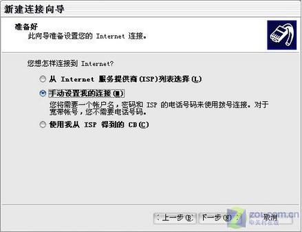 (3)在接下来的窗口中我们勾选第二项“手动设置我的连接”,并单击“下一步”按钮(如图7)。