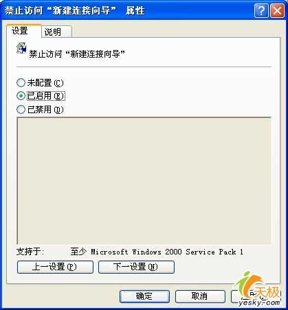 单击该设置窗口中的“设置”标签,并在对应标签页面中检查一下“已启用”选项是否处于选中状态,如果该选项还没有被选中的话,那我们必须及时将它重新选中,并单击一下“确定”按钮,这样的话小孩日后就无法在本地计算机系统中重新创建宽带拨号连接了。