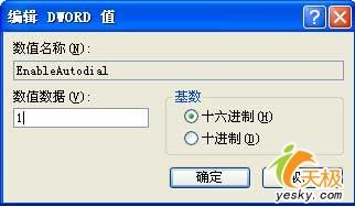 接下来用鼠标双击双字节值“EnableAutodial”,在其后出现的编辑双字节值对话框中,输入数字“1”(如图2所示),再单击一下“确定”按钮,最后将计算机系统重新启动一下就可以了。要是以后我们不想让计算机自动拨号的话,可以重新打开“EnableAutodial”键值的数值设置窗口,然后输入数字“0”,最后重启计算机系统就可以了。