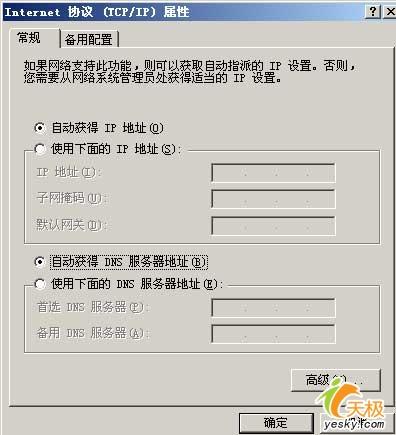 首先需要检查本地的网络连接参数是否设置正确,或者查看一下本地系统的TCP/IP协议是否发生了损坏。在进行这项检查操作时,我们可以依次单击系统“开始”菜单中的“设置”/“网络连接”命令,在弹出的网络连接列表窗口中用鼠标右键单击“本地连接”图标,从其后出现的右键菜单中执行“属性”命令,打开本地连接属性设置窗口。单击该窗口中的“常规”标签,并在对应标签页面的“此连接使用下列项目”设置项处双击“Internet协议(TCP/IP)”项目,打开TCP/IP属性设置窗口,如图1所示。