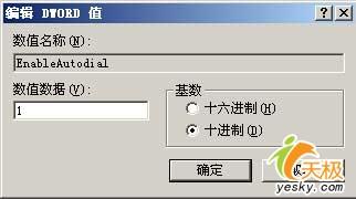 下面再右击一下“EnableAutodial”双字节值,执行右键菜单中的“修改”命令,打开数值设置对话框(如图4所示),将数字“1”填写在“数值数据”文本框中,并单击“确定”按钮,再重新启动一下计算机系统,那样的话其他计算机在本地就能进行宽带拨号操作了。