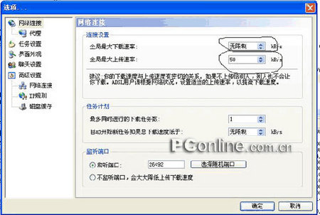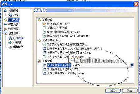 实际应用表明当adsl的上传速度达到理论上限,下载速度只能达到理论速度的60%。所以要更快的下载速度就必须限速,怎么限速看图吧。图8为总上传下载限速,图9为单任务上传限速。