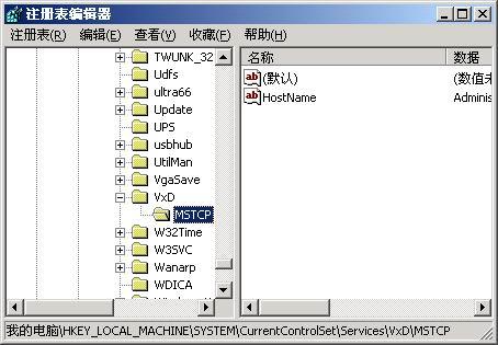 依次选中注册表分支HKEY_LOCAL_MACHINE\SYSTEM\CurrentControlSet\Services\VxD\MSTCP,如图2所示;