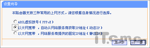 5、有线宽频上网:登陆TP-LINK路由器的WEB管理界面,通过“设置向导”选择“以太宽带,自动从网络服务商(例如:中国电信)获取IP地址(动态IP)”,设置完成后,重启CABLE MODEM就可以了。