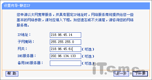 4、FTTB+LAN静态IP+WEB认证:登陆TP-LINK路由器的WEB管理界面,通过“设置向导”选择“以太宽带,网络服务商(例如:中国电信)提供固定的IP地址(静态IP)”,设置完成后,然后在IE地址栏里输入任一网址,都会弹出认证的对话框,填入网络服务商提供的拥用户名和密码就可以了。
