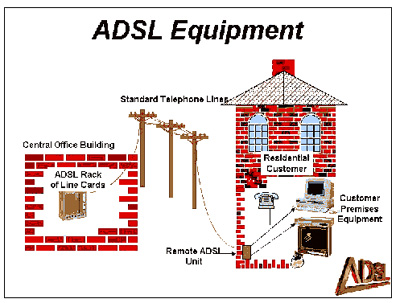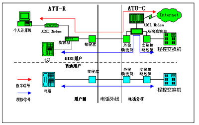 ADSL:在局端的部分为ADSL局端设备,在用户端的为ADSL用户端设备。