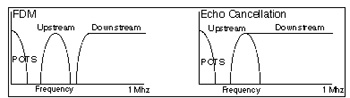 为了可以利用多个信道,ADSLModem采用两种方式划分可以利用的电话线路的带宽:FDM技术(FrequencyDivision MultIPlexing)或回波抵消技术(Echo CAncellation)技术. 如图1-2示. FDM方式将频带划分为上行部分和下行部分, 下行通道在被时分复用(Time Division Multiplexing)为一个或多个高速信道和低速信道; 而上行通道也会被复用为相应的低速信道。