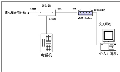 局域网用户的ADSL安装与单机用户没有很大区别,只需再加多一个集线器,用直连网线将集线器与ADSLMODEM连起来就可以了,