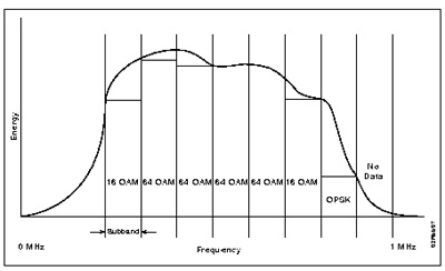 上图中,1MHz的带宽被分段为256个4KHz的子频带.每个子频带在发送端用single-carrier调制技术调制,在接收端则接收各子频带并将其256路载波整合解调制。由于美国的ADSL国家标准(T1.413)推荐使用DMT技术,所以在今后几年中,将会有越越多ADSL调制解调器采用DMT技术。