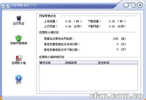 如果你刚刚申请了宽带接入,那么,网络的实际接入速度与所申请的是不是相符?在实际的使用过程中,如果你发现自己的网速突然之间变慢了,那么,是不是网络运营商已经发现你与他人采用共享的方式一同上网?是不是已经采用了限制流量的方式来控制共享上网?查看一下当前的网络流量就清楚了。启动共享神盾,默认显示的界面就是网络的运行状态(见图1),如果没有显示,那么单击一个“运行状态”按钮即可显示。在这里可以清楚的看到上传、下载流量、上行网速与下载网速。这样,我们就可以对自己的宽带了若指掌。