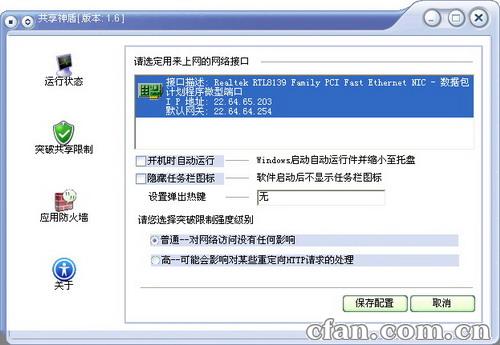 当发现自己的网速受到了限制,或者是只有一台电脑可以上网,而其他电脑却无法正常上网,那么就需要借助于共享神盾来突破网络封锁了。共享神盾采用Windows底层网络驱动及报文伪装技术,可以有效对付“网络尖兵、星空急速、南京信风”等网络封锁设备。单击“突破共享限制”按钮,然后在右侧选择用于上网的网卡,如果仅有一块网卡,则按默认即可。接下来选择突破级别,有“普通”和“高”两种,使用普通级别时对网络的访问没有任何影响,但使用高级别时可能会影响某些重定向HTTP请求的处理,使得部分网站无法访问,最后单击“保存配置”即可。在其他需共享上网的电脑上安装共享神盾软件,按相同方法进行设置,这样就可以实现所有的机器共享上网了(见图2)。