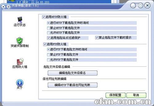 目前,网络上流氓软件、恶意网站横行,颇令用户头痛。通过共享神盾提供有防火墙功能,可以对1185个恶意网站进行过滤,同时在电脑自动下载恶意程序时会进行拦截,保护电脑的安全。神盾防火墙分为HTTP防火墙与FTP防火墙两种,同时提供了不同的安全级别火墙设置。在用户下载文件时,共享神盾就会弹出提示窗口,询问用户是否下载该文件。对于安全度较高的网址,可以单击“编辑HTTP下载信任网址列表”按钮,把其加到信任网址列表中。这样,以后再在列表中网站下载文件时,就不会弹出提示窗口了(见图3)。