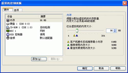 在左侧设备列表中选中“内存”项,然后在右侧拖动“这台虚拟机的内存大小”下的滑块,即可设置该虚拟机所用内存的大小(见图5)。注意,虚拟机内存设置得过大超出了实际的物理内存时,虚拟机将无法运行,这时可适当调小内存再试试。