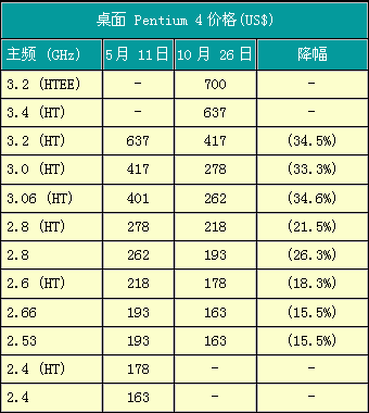 P4极限版的售价也在这次调价行动中显露了出来,3.2GHz版本为700美元,怪不得有人把P4EE称为“Pentium Expensive Edition(昂贵版)”呢。
