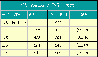 另外,面对移 动市场的Pentium M处理器也已经在10月5日调价,最高端的1.7GHz版本也有高达33.5%的降幅,而最新推出的Dothan内核的1.8GHz版本售价637美元。