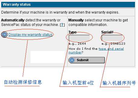 用户可以点击"Display my warranty status" 来检测机器的保修信息(本机),或者在Type 框中输入机型的前4位数字,在Serial#框中输入序列号手动查询。输入相关信息后,点击"Submit"按钮手动查询。查询结果如下: