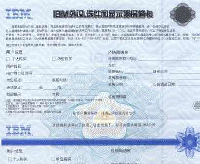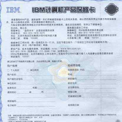 IBM 从今年的2月份开始执行了新的保修卡,此次推出的保修卡由用户持有联和经销商回执联两部分组成, 产品的详细信息包括产品名称, 型号和主要部件配置表等将打印在保修卡上。 为了防止和杜绝假冒保修卡的发生, 确保机器与保修卡唯一对应。