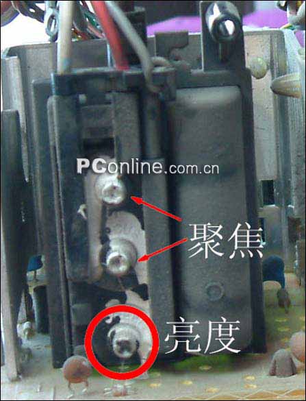 聚焦:15寸显示器使用的是单聚焦,而17寸的显示器使用的都是双聚焦,就是控制聚焦的电位器有两个,这样可以使聚焦更精确,图像更细腻。调整聚焦的电位器在高压包上,标有字母“FOCUS”字样。只要有一点的电工基础,我很快就可以教会他!