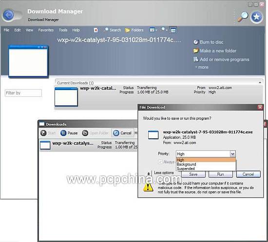 使用过IE下载文件的朋友都知道它的下载管理功能很单一,而且只能单线下载。微软终于在新IE中对下载管理进行大刀阔斧的改进,新的下载文件管理器功能很强大,可以设置该下载任务的下载级别:高速,后台运行,暂时挂起(真是众望所归啊......),在下载完成时还可以马上进行刻录。