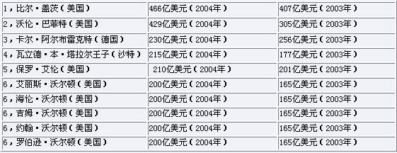 美国“福布斯”杂志26日公布了全球最富有的10个人的名单,其中8个是美国人,比尔·盖茨蝉联首富。以下是10个人的名单以及他们的家产。
