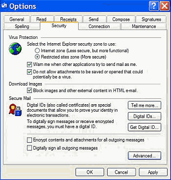 Ooutlook Express将阻止外部Email中的图片和HTML内容,并且防止潜藏的恶意附件被打开。