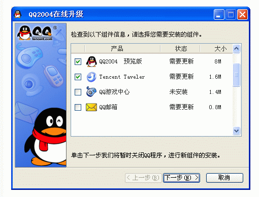 QQ 2004拥有智能化在线升级功能。你可以随时检测各个组件的状态和大小。选择性升级你需要的组件。轻松完成自由升级!