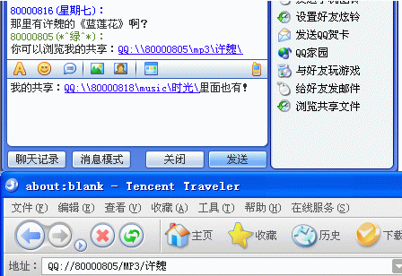 共享文件夹是向好友展示,和同好友分享您的珍藏的个人空间。QQ 2004充分考虑了广大QQ用户的切实需求,支持共享文件夹的网页浏览。您只需在浏览器的地址栏中输入: QQ:\对方QQ号码。即可浏览对方的共享文件夹,非常方便快捷。