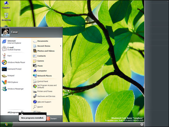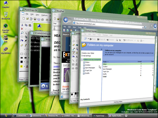 微软去年秋天就在视窗专业开发者论坛上发布的Longhorn Alpha测试版,不过这个版本看上去整体性不强,WinFS文件系统、3D界面(Aero)等新功能都像是简单添加进去的。在今年的WinHEC上,微软又拿出了Longhorn的4072版,这个版本将各部件进行了更好的整合,也带来了各项新功能、新概念。