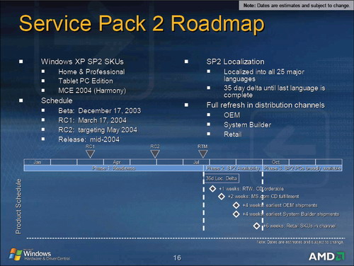 微软针对WindowsXP操作系统推出的SP2补丁可以说是目前最引人关注的一项补丁了,很多人都在关注这个补丁到底会在何时推出,日前在WinHEC会议上透露的一份AMD官方资料中公布了有关SP2发布时间的相关信息: