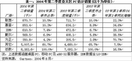 Gartner于8月12日发布的一份报告显示,联想在2004年第二季度重新从惠普手中夺回亚太区销量第一的排名。此外,由于兼容机及中小品牌厂商逐步退出市场,亚太五大供货商的销量都获得了两位数字的增长,市场占有率相应扩大。