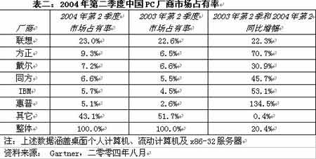 在第2季度中,联想以23%的市场占有率高居中国销量榜榜首,方正以9.3%的市场占有率排在第二位 (详见表二)。