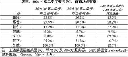 IBM继续以25.8%的市场占有率雄踞销量榜首,HP以23.6%的市场份额紧随其后 (详见表三)。IBM在移动PC领域依然处于强势,而惠普则是销量第一的桌面PC供应商。有闯劲的惠普对IBM形成一定的压力,特别是在桌面PC领域。戴尔和宏基则继续排在市场第三和第四的位置上。