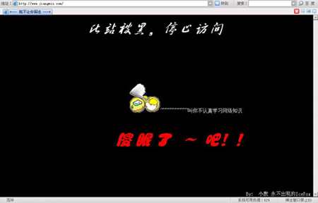 这次黑客图文并茂地留下了它的涂鸦:“此站被黑,停止访问。叫你不认真学习网络知识,傻眼了吧?”,对比起上次河马史诗伸张正义型的字句,该名叫IceFox的黑客似乎是抱着一种游玩的心态将江民黑掉的。