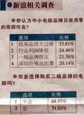 中关村某电脑公司的马经理说:“中小品牌电脑的资金实力不足,近年来的价格战又让行业整体利润下滑,市场洗牌就是这个结果。”