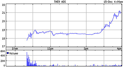 中国网络游戏运营商第九城市(简称九城,NASDAQ:NCTY)昨晚在美国纳斯达克挂牌交易,开盘价19美元。至纳斯达克收盘,该股收于21美元,较开盘价高出2美元,比其17美元的发行价高4美元,涨幅达23.53%。