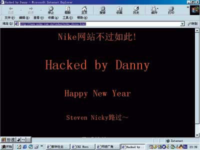 记者打开浏览器,键入www.nike.com.cn后打开网页,发现页面一片黑,在页面上写着几行大红的中英文。第一行写着“Nike网站不过如此?选”下面是一个自称为丹尼的人承认“黑”了耐克网站。在这两行字的下面还有分别用中英文写的“新年快乐”、“斯迪文.尼克路过”、“最爱笨笨!”等字样。