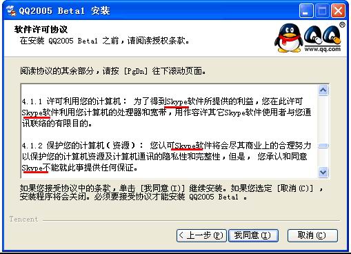 据悉,4月1日,第一批下载并安装QQ2005Beta1版的用户发现QQ2005Beta1安装目录下的license.txt文件下有如下语句: