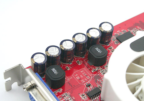 该卡用料还不错,全部使用红宝石电解电容,一字排开,配搭封闭式的电感,更有效抵抗电波干扰。