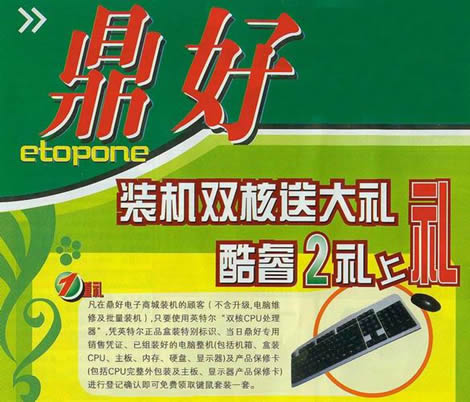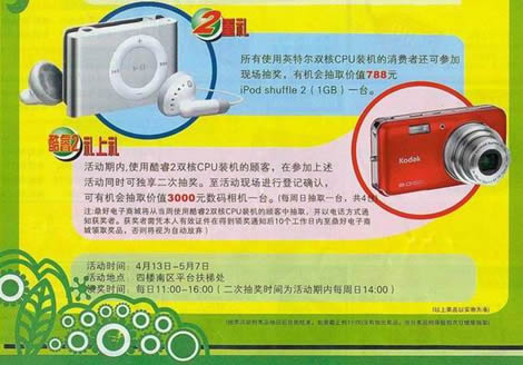 自本月13日起到五一期间在鼎好装机,时尚键鼠套装、ipod shuffle 2、数码相机这些有可能被你“一网打尽”!活动期间,凡在鼎好内选购配有“英特尔双核CPU处理器”电脑的顾客,即可凭借产品及相关销售凭证领取每日限量100份的键鼠套装一套;符合上述条件的消费者还可参与现场抽奖,更有机会赢得每日送出的最新ipod shuffle 2(1G)MP3一台。值得一提的是,倘若装机用户采用英特尔“酷睿2双核CPU”装机,还将独享二次抽奖,有机会拿走每周日开出的价值3000元的数码相机一台,活动期间共有4台数码相机等待被“好手气”的人抽走。