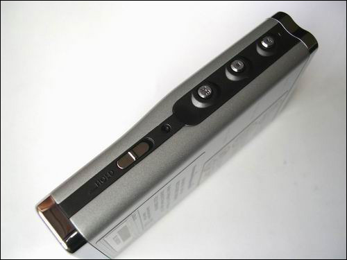 播放器正面,采用了镁金属外壳,宽大的液晶屏占了大约1/3的面积,液晶屏下面是摇杆式操纵杆和充电(绿色)、读盘(红色)指示灯。
