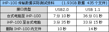从上面表中的数据中可以看出,在USB1.1的接口上传输数据时,瓶颈主要在USB接口上。而换到了USB2.0时,就可以看出硬盘本身的写入速度成为了瓶颈。这里需要说明的是,在使用USB2.0接口传输数据时,iHP-100会发出很大的热量,而使用USB1.1时虽然速度较慢,但发热情况要明显好很多。