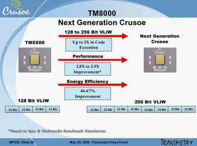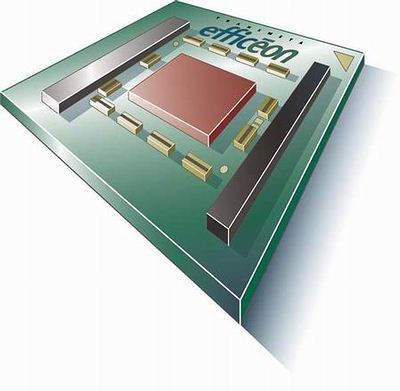 8月12日,全美达正式决定将其新一代处理器Crusoe TM8000的名称,从原先的Astro改为“Efficeon”。新的Efficeon处理器采用台积电的0.13微米制程生产,定位在轻薄型笔记本电脑市场,所提供的指令执行性能预计为目前最快的Crusoe TM5800处理器的两倍,另外Efficeon还支持SIMD单指令多数据的执行方式,支持3Dnow和SSE2两种类型的SIMD。Efficeon处理器内建DDR266/333/400内存控制器,可以采用400MHz的Hypertransport总线与其它厂商的南桥芯片连接,首批Efficeon将搭配Ali智扬的南桥芯片,支持WLAN无线通讯技术。[图51]“Efficeon”是全美达最新高效能TM8000微处理器家族的品牌名称和产品标志 [图52]全美达Efficeon处理器模拟图 Efficeon处理器将有全新的架构,将采用到AMD Athlon64的部份设计概念。根据全美达的系统行销总监John Heinlein表示,TM8000也就是之前的Astro,将整合北桥功能,通常北桥芯片是用来桥接处理器与主记忆体的一块独立芯片。同时该芯片将藉由超传输(HyperTranport,一种晶片间的高速传输线)来连接其他零件。 Heinlein进一步指出,TM8000将拥有全新的处理器核心。他说,“TM8000的效能将有非常非常的竞争力。”整合北桥芯片及采用超传输,基本上可以解决现有个人电脑的一项瓶颈。在现有的电脑里,处理器通过相对较慢的总线(bus),或是资料通道,把信号传送到北桥,然后在信号传回之前,还要利用另一个同样较慢的总线从内存里取得资料。整合内存控制器则可免去第一个总线的限制。 除了采用新的连接线之外,TM8000将采用全新的架构,每个时钟频率周期可以处理最高八个指令。现有的全美达芯片每个周期最高只可处理四个指令。这个方法可以在提高效能的同时还可以更加省电。