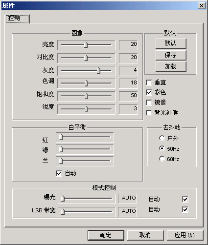 摄像头的调节参数主要有亮度、白平衡、色彩补偿和调焦。其中白平衡的含义是摄像头调节颜色的能力,质量好的摄像头具有较佳的自动白平衡调整功能,也就是在光源颜色并非纯白的时候,摄像头调整三原色的比例而达到色彩的平衡,使被拍摄对象不至于因为光源颜色而产生偏色。