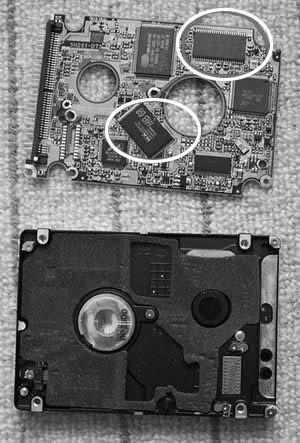 接触到一些朋友,一提到硬盘首先提到的就是转速,其他的一概不提。在他们的心里,转速已经是硬盘性能的衡量标准。转速对于笔记本电脑硬盘固然重要,但我们也不要忽视缓存在硬盘性能上起到的至关重要的作用。早期硬盘的数据缓存只有128KB甚至更小,而那时2MB的数据只能在高端的SCSI硬盘上看到。在接口技术已经发展到一个相对成熟的阶段时,缓存的大小与速度是直接关系到硬盘的传输速度的重要因素。目前主流硬盘的缓存主要有512KB和2MB等几种。其类型一般是EDO DRAM或SDRAM,目前一般以SDRAM为主。图4为笔记本电脑硬盘的控制电路和缓存。