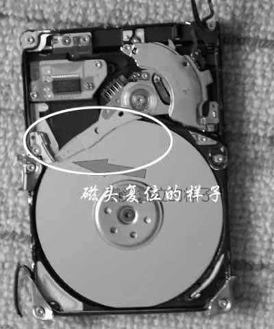 说到笔记本电脑硬盘的磁头,我不想再讲过多的深奥难懂的技术参数了。首先让大家看看图5(磁头的Park)。